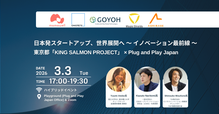 日本発スタートアップ、世界展開へ 〜 イノベーション最前線 〜 東京都「KING SALMON PROJECT」 × Plug and Play Japan Mar 3, 2026 17:00-19:30 Playground(Plug and Play Japan 東京オフィス)& Zoom